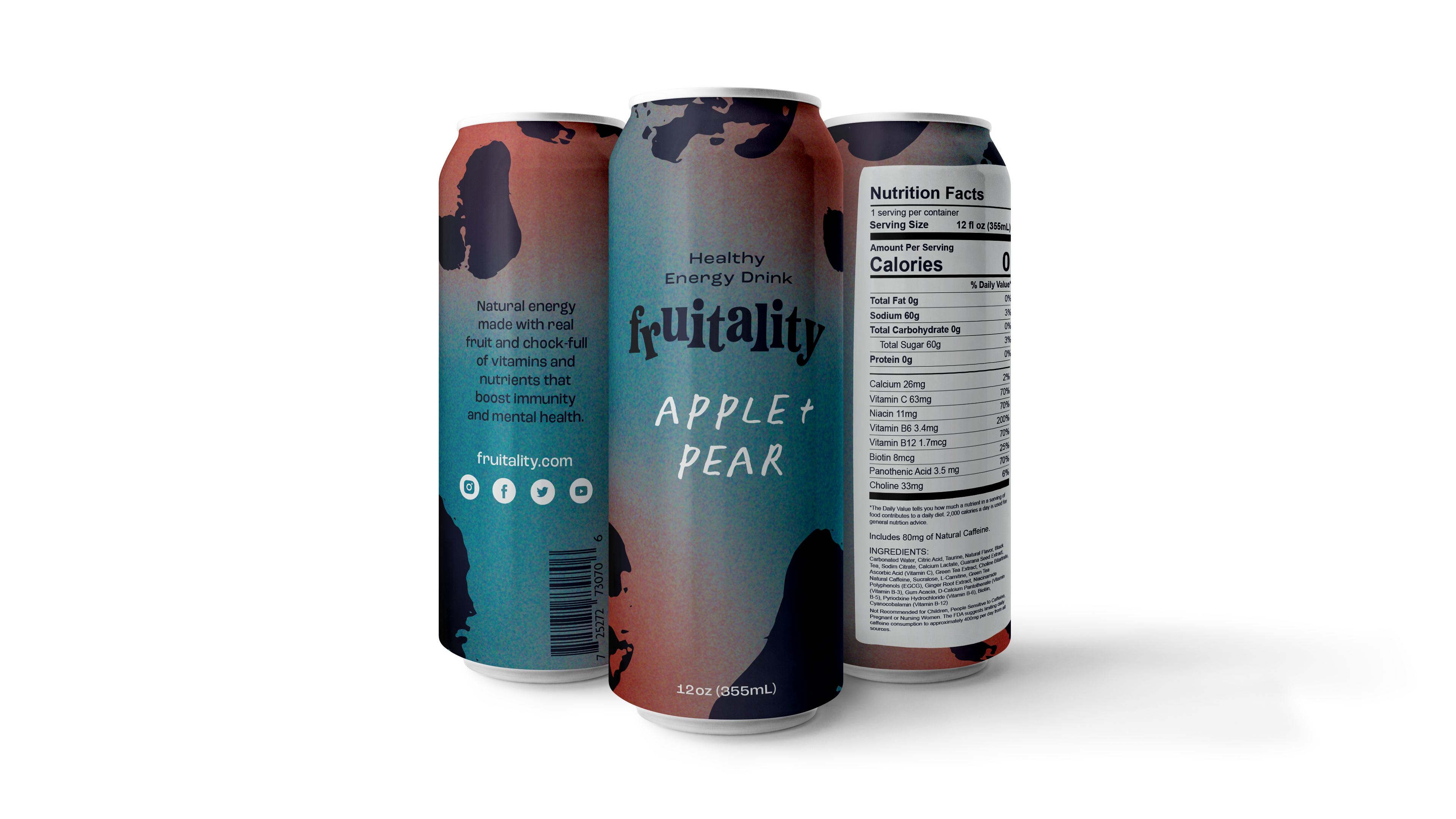Fruitality is a brand of healthy energy drinks made from real fruit and packed full of vitamins and nutrients. It’s the anytime-of-day pick-me-up that’s actually good for you. To represent Fruitality’s mission for providing a nutritious and energizing refreshment, the brand is represented through a handmade and organic aesthetic. This is created through hand-stamped fruit slices, a colorful, yet sophisticated palette,