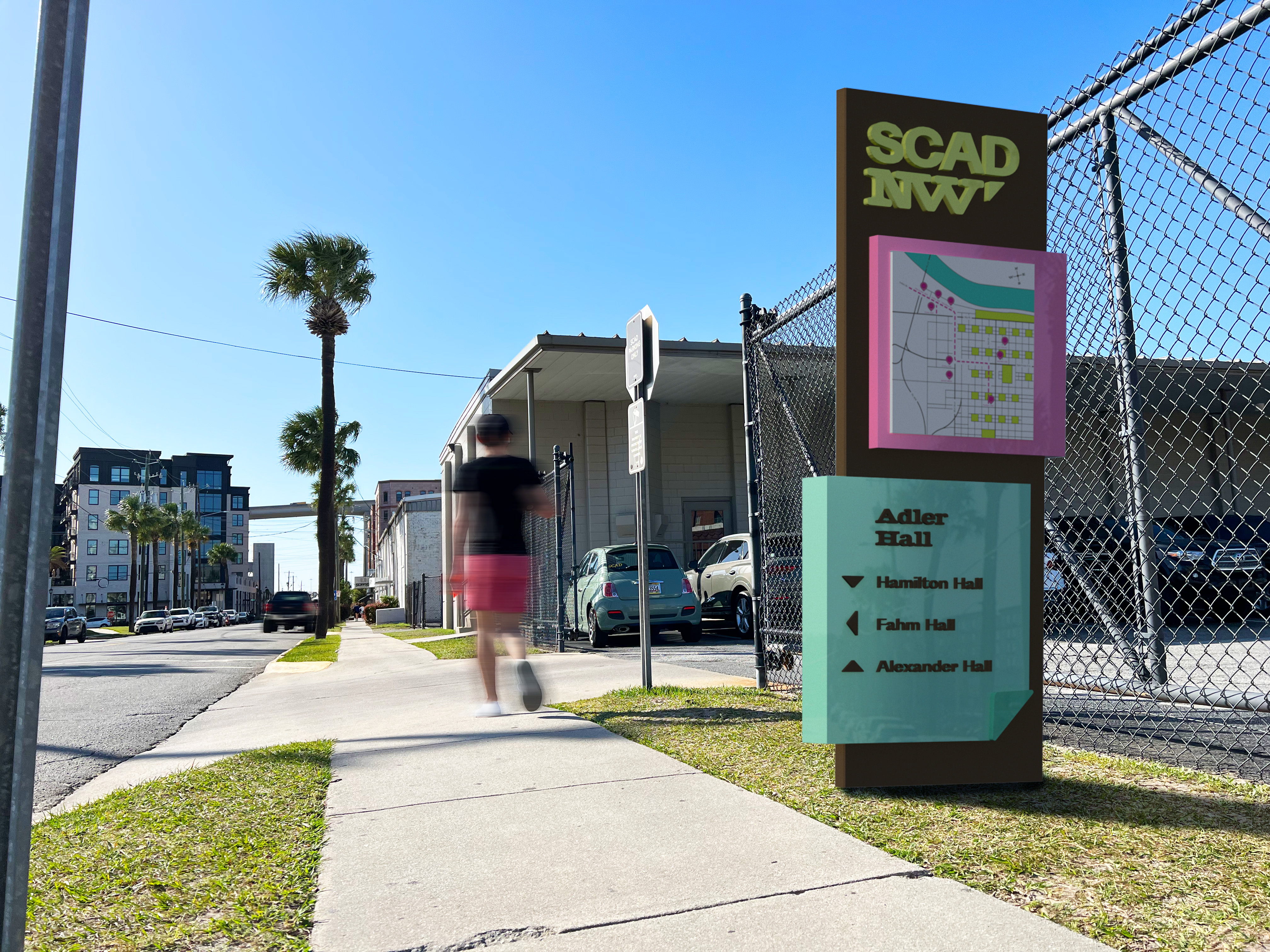 Wayfinding | Environmental DesignSCAD Northwest provides easy navigation for students, faculty, and visitors of the Savannah College of Art and Design as they travel from Poetter Hall to the buildings in the northwest corner of campus. Taking advantage of Savannah’s walkability, signage directs pedestrians through a scenic, yet direct, route while remaining consistent with SCAD’s core principles and values.